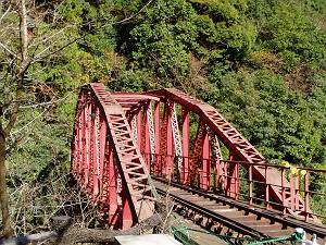別子銅山の最後の中心であった端出場地区を今に伝える鉄橋。山林の中に在る赤い鉄橋は、実にめざましく映えており、生命力あふれる明治の勢いを感じさせます。