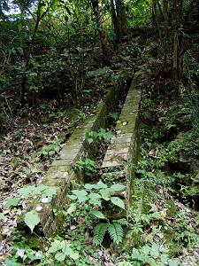 マイントピア別子の敷地内から見ることのできる水路。坑内から発生した水は鉱毒の原因となるため、緩流区域では木製の水路を、このような急斜面では煉瓦造の水路が作られ、土壌が鉱害によって汚染されることを防いでいます。