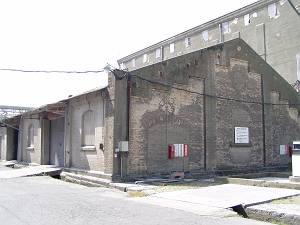 かなり大規模な煉瓦造倉庫型建築です。鉱滓煉瓦を使用しているかのような色合いをしていますが、実はれっきとした赤煉瓦建築。しかし煉瓦には薄くセメントがこびり付いており、遠くから見るとそうとは思えないような煉瓦建築となっています。