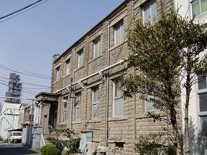 工場の中でも中央部奥寄りにあるにもかかわらず、姿にそれ相応の景観的配慮を感じさせる建物です。コンクリートブロック造り建物群と玄関部分や窓周りに共通性が見られますが、あからさまなコンクリートブロックを採用していないところに、実験的な趣も感じさせている建物といえます。