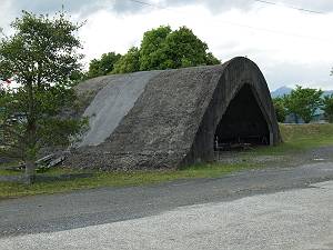後部の補修が若干目立つ掩体壕施設。工場入口手前側にある掩体壕は文化財登録されていますが、こちらはなぜか登録されていません。一方に比べ若干小振りに見えることと、破損と応急補修の跡がくっきりと見える事が文化財登録されなかった原因であると言えるでしょう。