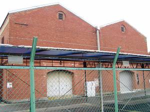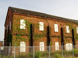 近代的な穀物貯蔵庫と向かい立ち、その堅牢さを見せつけている倉庫。1階部分は鉱滓煉瓦で飾っていますが、上層を見るとコンクリートで造られている事が良く分かります。