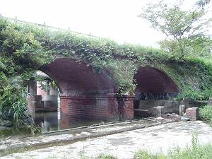 この構造物の面白いところは、煉瓦2連アーチ橋であると言うところでしょう。九州でこのような橋の形状だと、大正期まで石橋の場合が多く、煉瓦の眼鏡橋はかなり新鮮な印象を受けました。水門に隣接した施設のため、普段はこのアングルで見ることが出来ません。(18.)