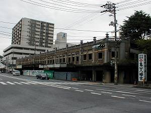 この写真を撮ったのは、ちょうど2001年の夏頃。もう既に市場としての機能は移転したあとで解体を待つばかりといった状況でした。写真右手には亀山八幡宮があり、この建物の屋上部は神社への参道として利用されていた時期もあったそうです。屋上部の燈籠のような飾りはこれに基づいたもののようです。