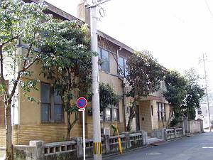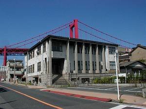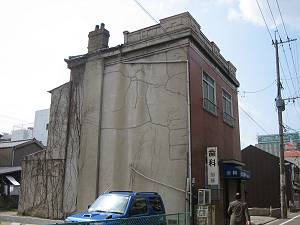 若戸大橋のたもと、海岸線に背を向けるようにして建てられています。関門地域では最古級の鉄筋コンクリート造の作品で、どちらかというと装飾は少なめですが、玄関周りに時代性を感じさせる建物です。中の階段は狭く、高級感などといったものからはほど遠いものがありますが、実用性を重視した堅固な造りという印象を受けました。