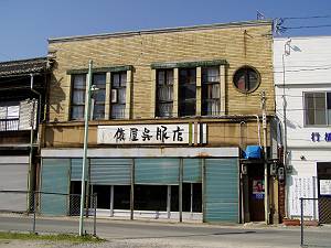 角地にある、総2階建の近代和風建築。周囲には他の近代化遺産が残り、それらの中で見た目の派手さは見られないものの、よくみると1階部分はショーウインドー(見せ場の延長線にあるようなつくり)として作られ、表通りにふさわしいものであったのだと理解できます。